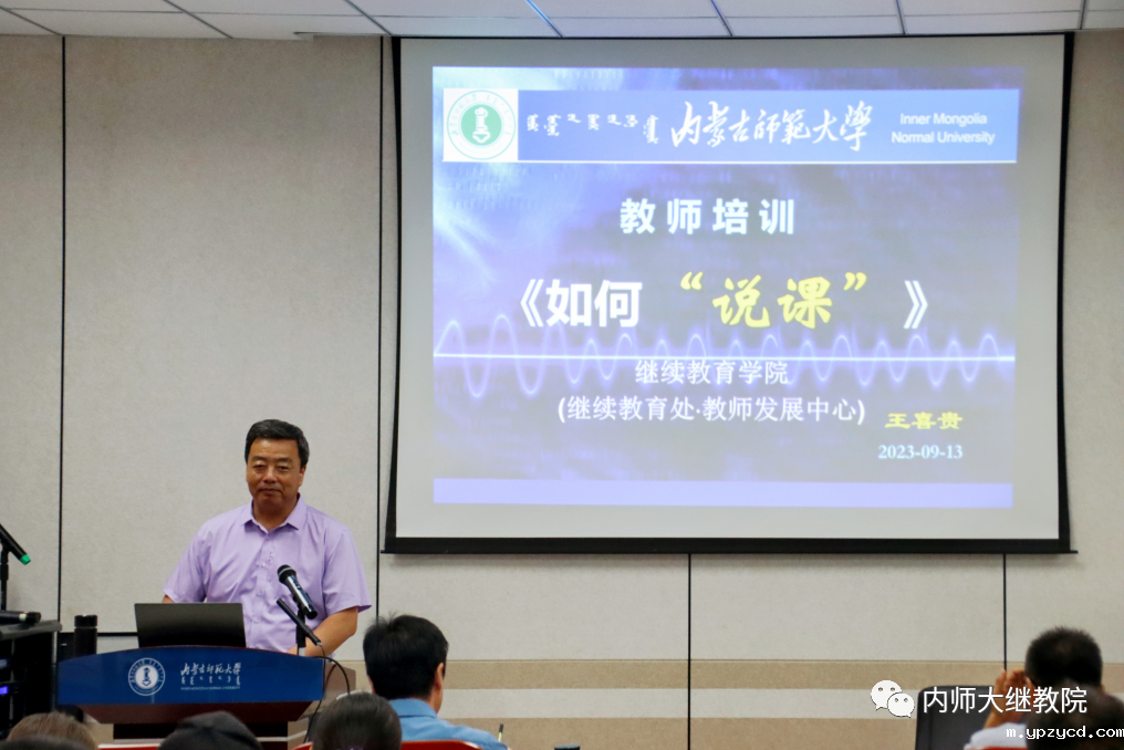 为提高我校青年教师的教学水平,进一步夯实青年教师的教学基本功,建设一支专业过硬、素质优良的青年教师队伍,9月13日,我校继续教育学院(继续教育处、教师发展中心)邀请王喜贵教授在赛罕校区文史楼三楼学术报告厅为我校教师开展了题为《如何“说课”》的专题培训。来自我校各学院、各部门100余位教师参加了培训。